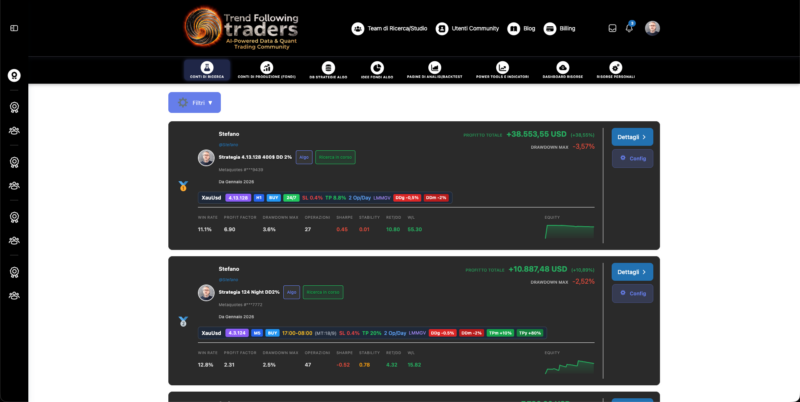 L’ambiente dove le nuove strategie vengono messe alla prova prima di passare in produzione. I conti di ricerca sono sincronizzati in tempo reale con MetaTrader 5 e mostrano statistiche complete, posizioni aperte, equity curve interattive e lo storico operazioni dettagliato. È lo spazio dove sperimentiamo varianti, ottimizzazioni e nuove idee — con capitale ridotto e piena trasparenza sul processo.