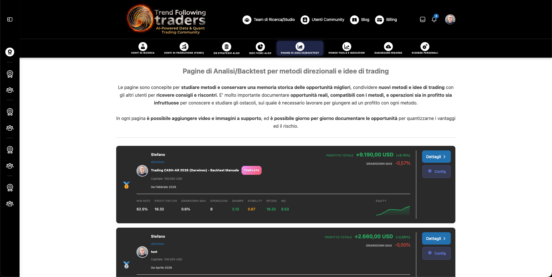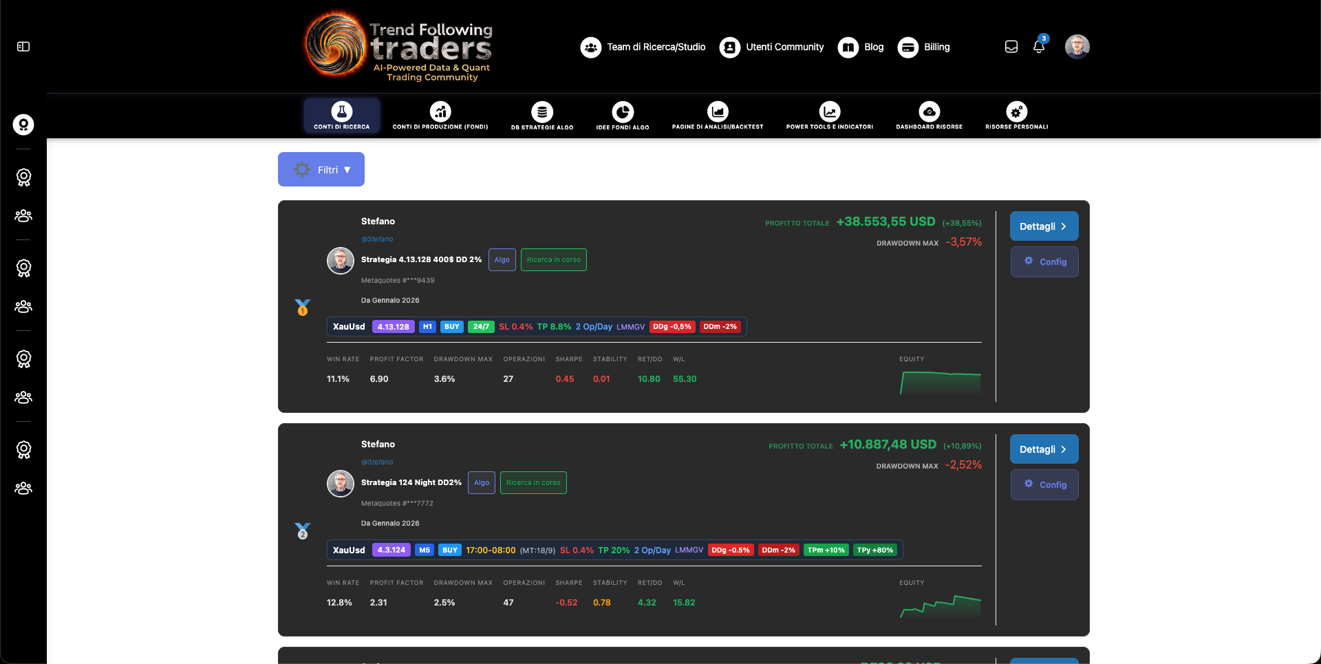 Uno strumento per documentare e condividere ricerche di trading, sia direzionali che quantitative. Puoi caricare backtest in formato SQX, analizzarli con grafici interattivi e usare la funzione di ottimizzazione dinamica — esclusiva della piattaforma — per simulare in tempo reale l’effetto di variazioni nei lotti, nel drawdown limit e nei filtri orari e giornalieri. Utile sia per sviluppare nuove idee che per condividerle con gli altri membri.