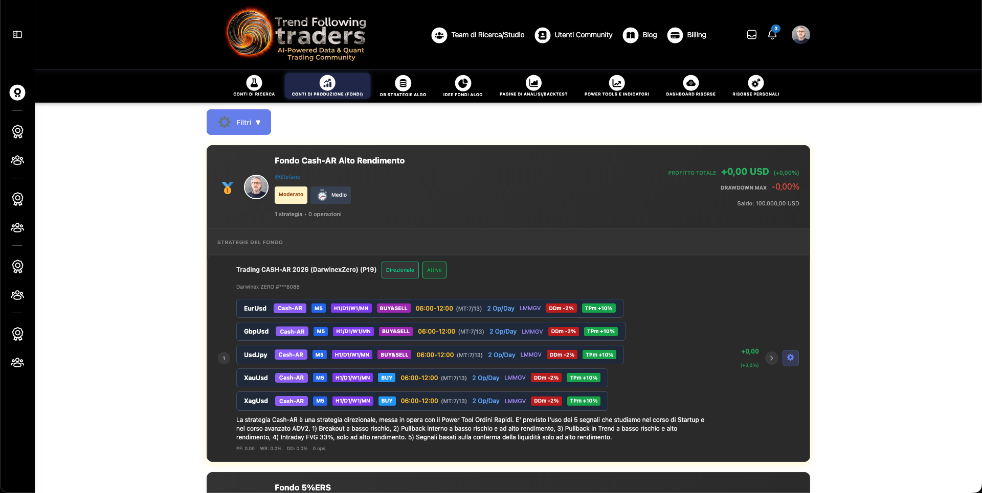 Il trading reale, organizzato in Fondi multi-strategia. Ho introdotto la struttura a Fondi per gestire portafogli diversificati su più broker, separare strategie con diversi profili di rischio e mantenere una visione aggregata delle performance. Ogni fondo ha un profilo di rischio configurabile — Conservativo, Moderato, Aggressivo — e un orizzonte temporale definito. Tutti i risultati sono verificabili e aggiornati automaticamente: nessun dato ritoccato, nessuna finzione.