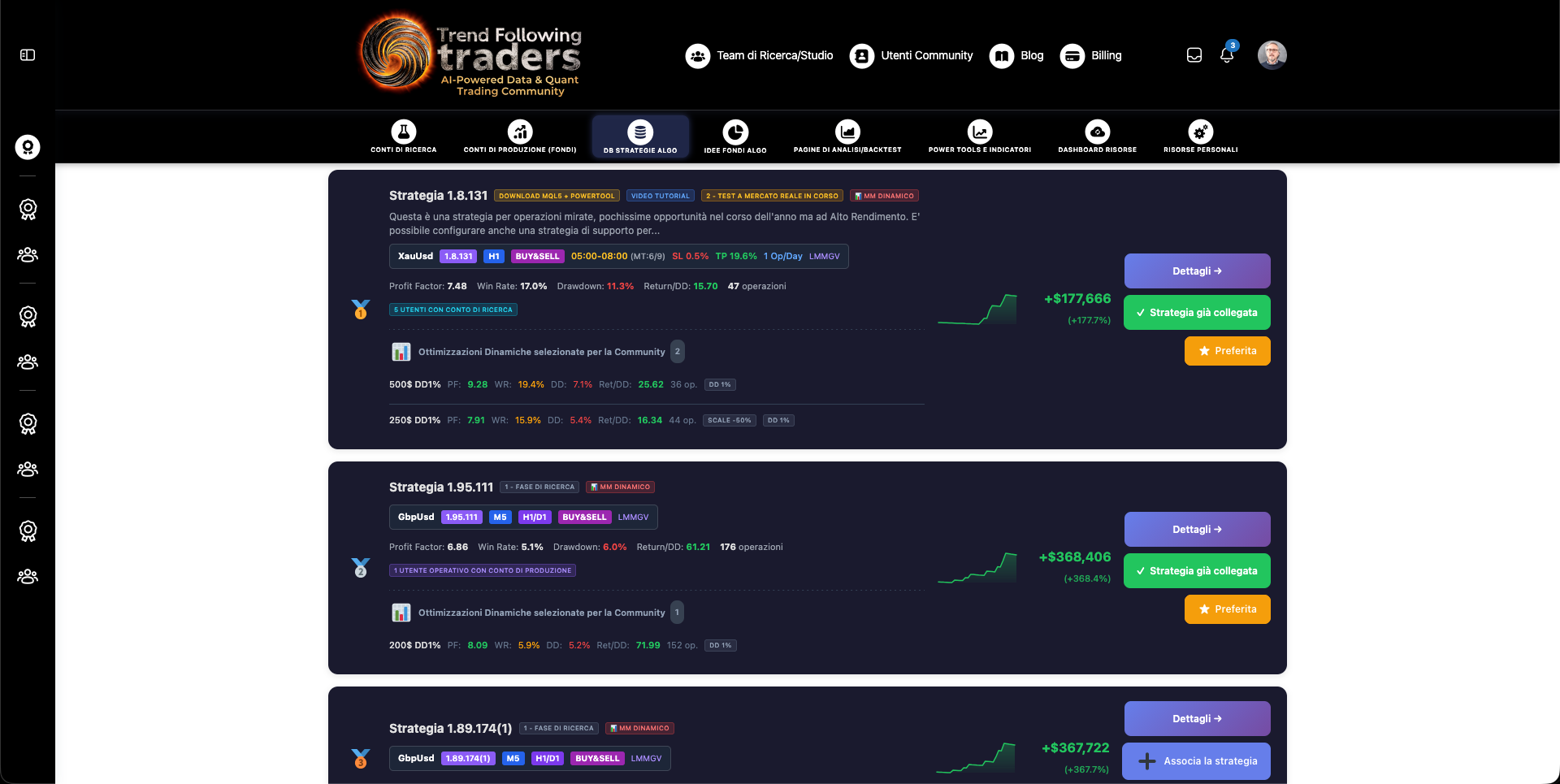 Il database centrale di tutte le strategie algoritmiche sviluppate e validate dal team. Per ogni strategia trovi backtest verificati, statistiche complete — Profit Factor, Drawdown, Win Rate, Sharpe Ratio — equity curve storiche e un sistema di badge che indica mercato, timeframe, orari operativi, direzione e parametri di rischio. Ogni strategia passa attraverso tre fasi: Ricerca, Test e Operativa. Solo quando ha superato la validazione out-of-sample e il forward test in ambiente reale viene resa disponibile per il download dell’Expert Advisor su MetaTrader 5.