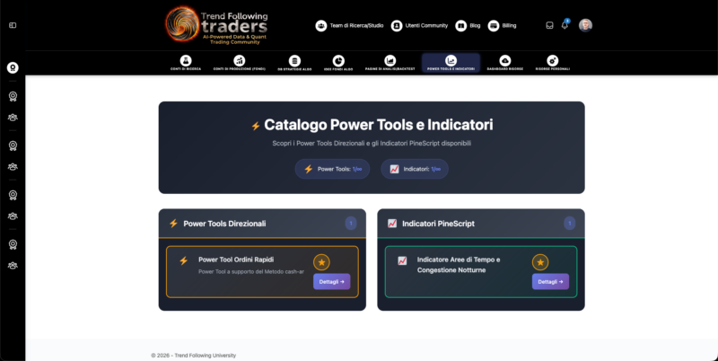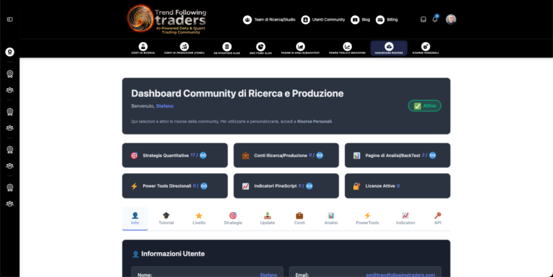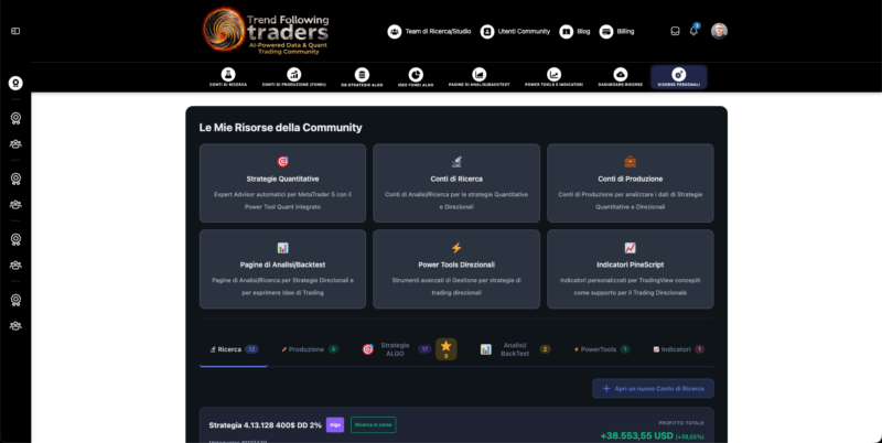 Dal 2014 sto costruendo un laboratorio di ricerca aperto. Quello che trovi qui dentro non sono corsi preconfezionati: sono gli strumenti reali che uso ogni giorno per sviluppare, testare e mandare in produzione strategie di trading direzionale e quantitativo. Come guida generale per tutti gli utenti spiego il mio trading basato sui principi di Trend Following e le mie ricerche.